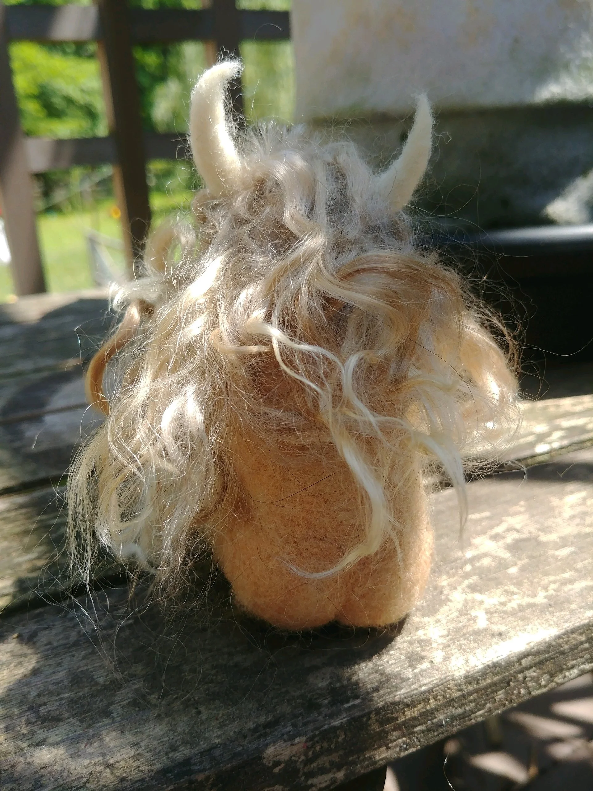 Now, originally he just looked like a little old man, the size of a child, with glowing eyes. I tried to stay as close to the description I found on this page, though I did give him black glass eyes because I thought he looked cuter with it. Also, I decided to keep the horns, even though the horns were a much later addition (along with a tail, which I did not add), thanks to Christianity trying to associate him with the devil and devilish-type things. But in this case, I thought the horns looked cute and would help to differentiate him from simply being a doll of an old man, or a naked gnome without a hat.