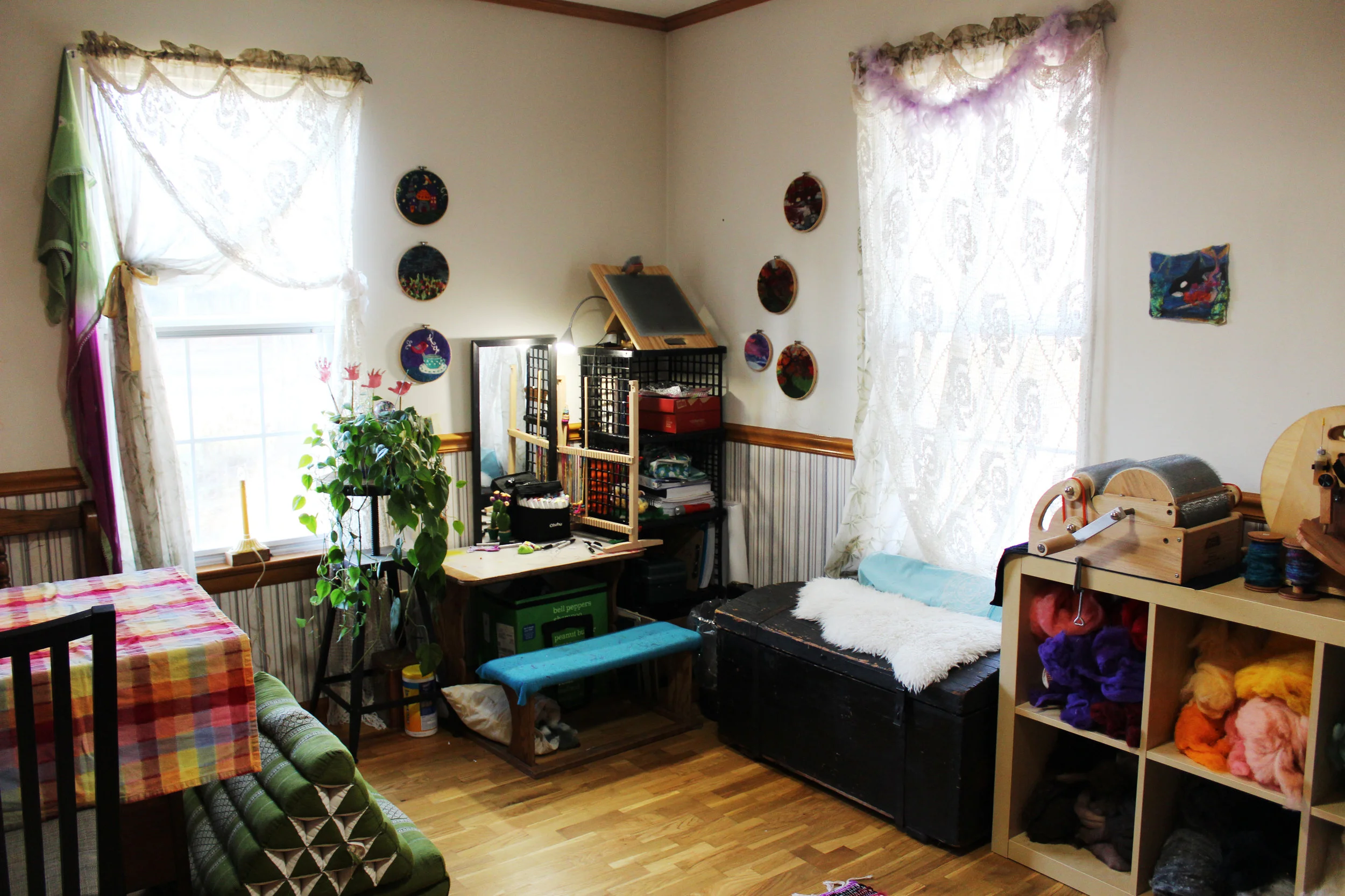 I’m not sure if you can see the scribbles on the wall behind the bench, but that’s one of the several reasons my 3 year old isn’t allowed in there currently. I’m not worried about cleaning up the walls, because at some point the plan is to take the old wallpaper and chair rails down and repaint the whole thing. The other reasons include his constantly pulling all the wool off my shelves and all over the floor, and sharp pointy objects. There’s also the issue of my daughter’s obsession with alcohol markers (and keeping them out of his reach), and in general her need for a space to create where she doesn’t need to worry about him getting in her stuff. In a year or two hopefully I’ll be able to open the room up to him too (though I don’t have room for any more tables so they’ll have to learn to share or something).