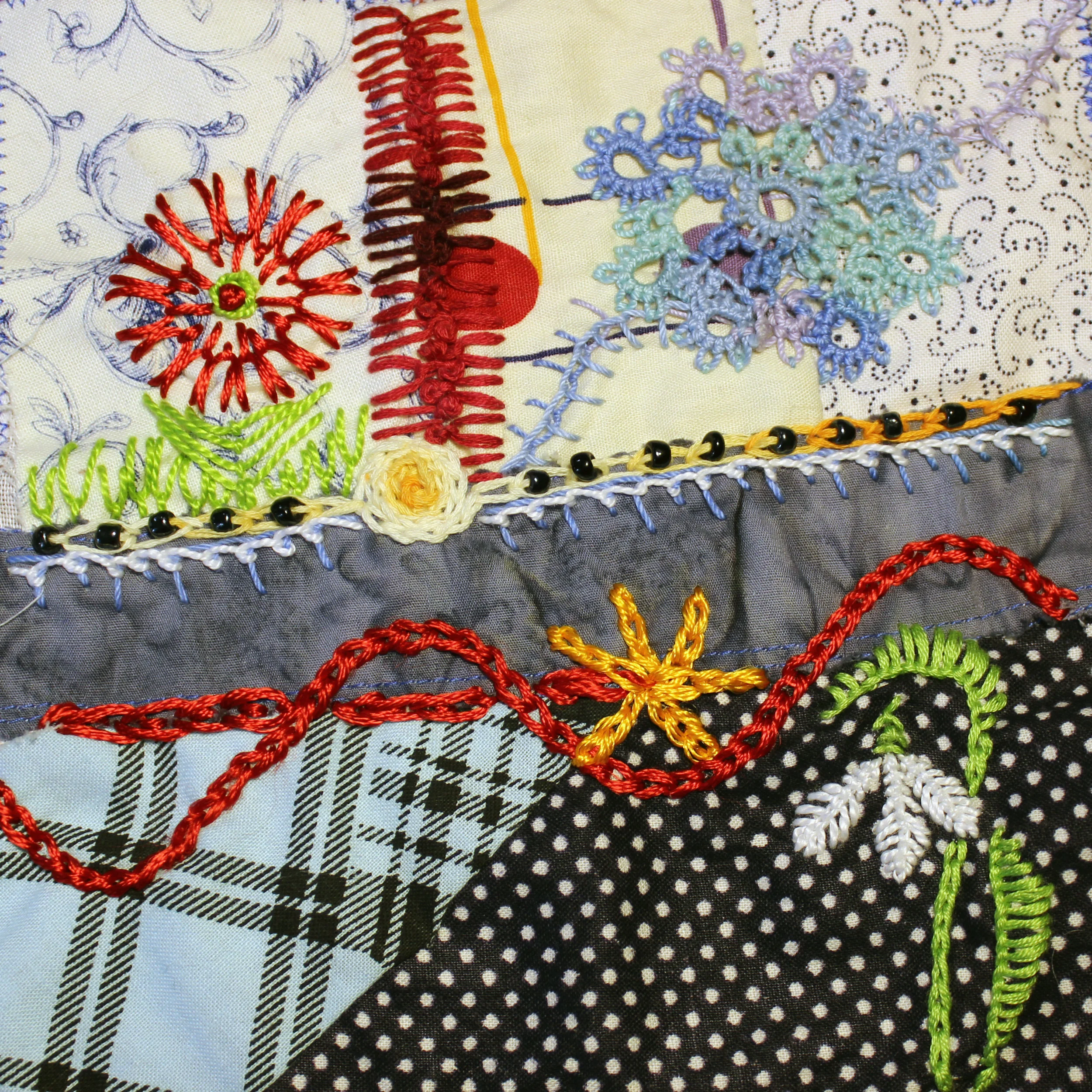 This week’s challenge stitches were the buttonhole stitch (what I think most people know as the blanket stitch) and the reversed buttonhole bar. You can see the buttonhole going in a swirl (back to back) in the top right, under the medallion. Considering the medallion is the first thing I ever made with tatting shuttles (and made this month), I wanted to add it to this block (also first ever crazy quilt I’m in the process of making). I did the reversed buttonhole bar on the blue strip in the middle, under the beaded linked chain stitch. At first I was having difficulty feeling inspired with this stitch, but then I remembered I wanted to add a snowdrop for January (bottom right) which I made using the fly stitch, and then used the buttonhole to make the leaves, and chain stitch for the stem.