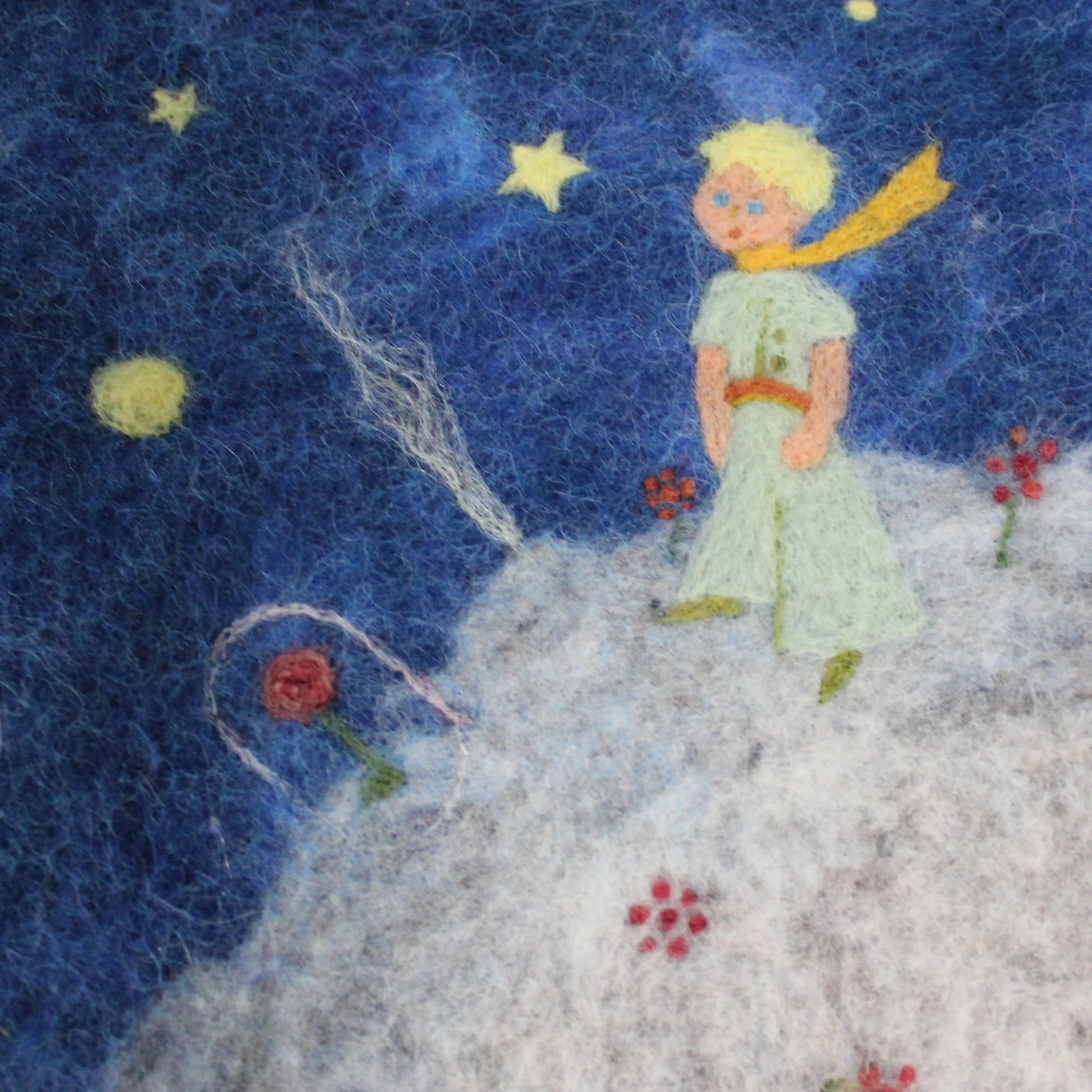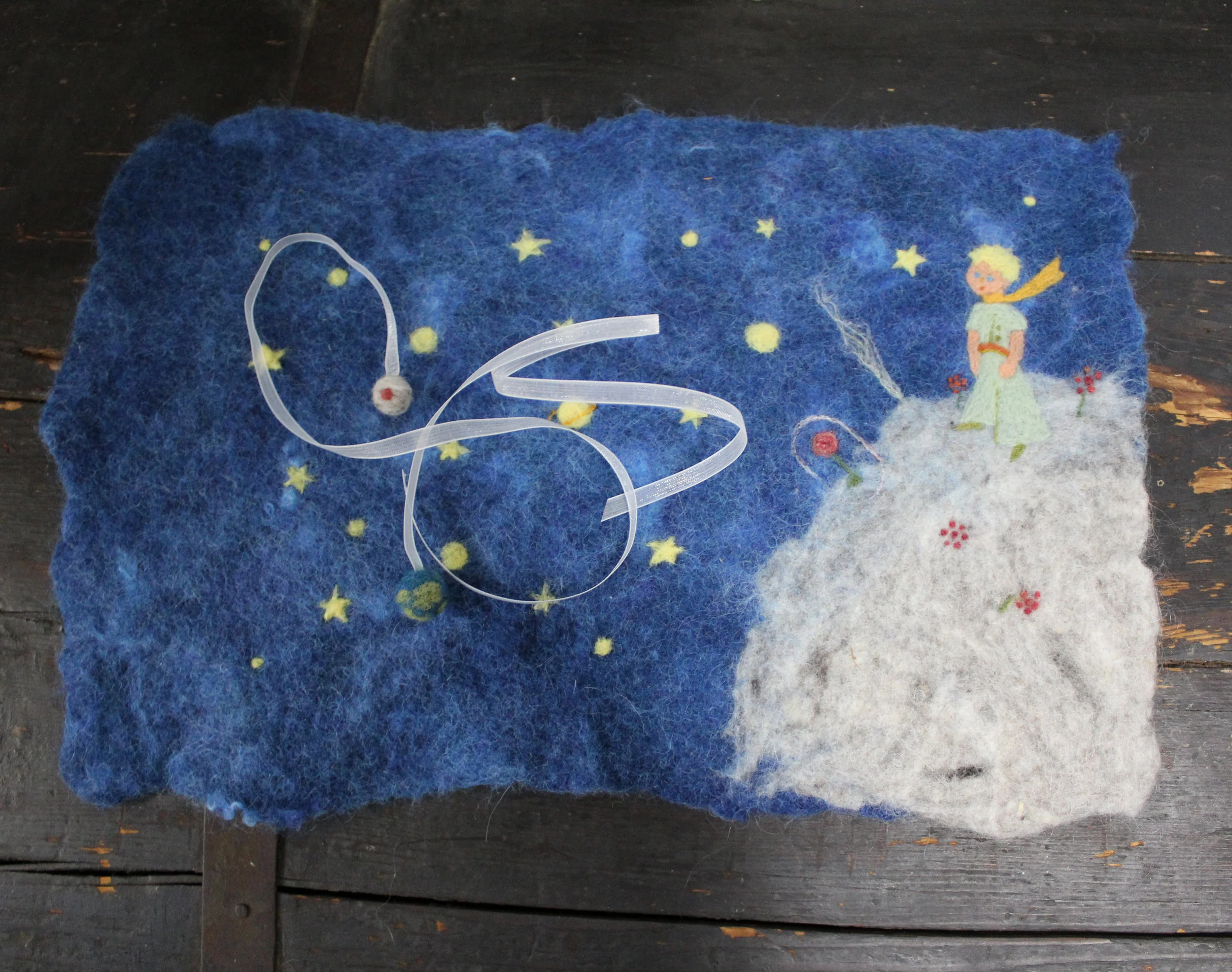 Those two ribbons on the cover are what will be the bookmarks once the cover is stitched with the inside. I decided to needle felt his asteroid on the end of one of them (the red dot is supposed to be the rose, I may see if there’s anything I can figure out to make it look less like a dot) and the other is the Earth, where the majority of the story takes place. Pretty excited about this one, and hopefully will have it up in the shop next week!