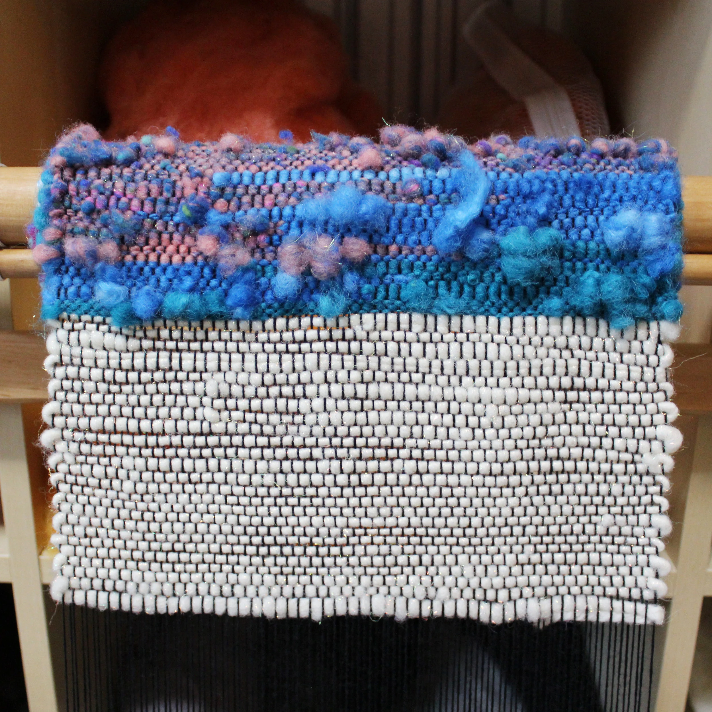Since the yarn on the corespun I made last Saturday was smooth, there wasn’t any fancy textural stuff going on. It definitely added quite a bit of sparkle though, in addition to the change of color! I don’t know if you can see, but despite beating as best as I could, there are more gaps between the yarns here than in the past. Maybe it’s because the corespun isn’t as “fluffy” so it doesn’t fill in? I have no idea. Ironically, I’d always wanted to learn how to make a very loose weave, so I’m not upset about this. I’m just curious why it didn’t want to “stick.”
