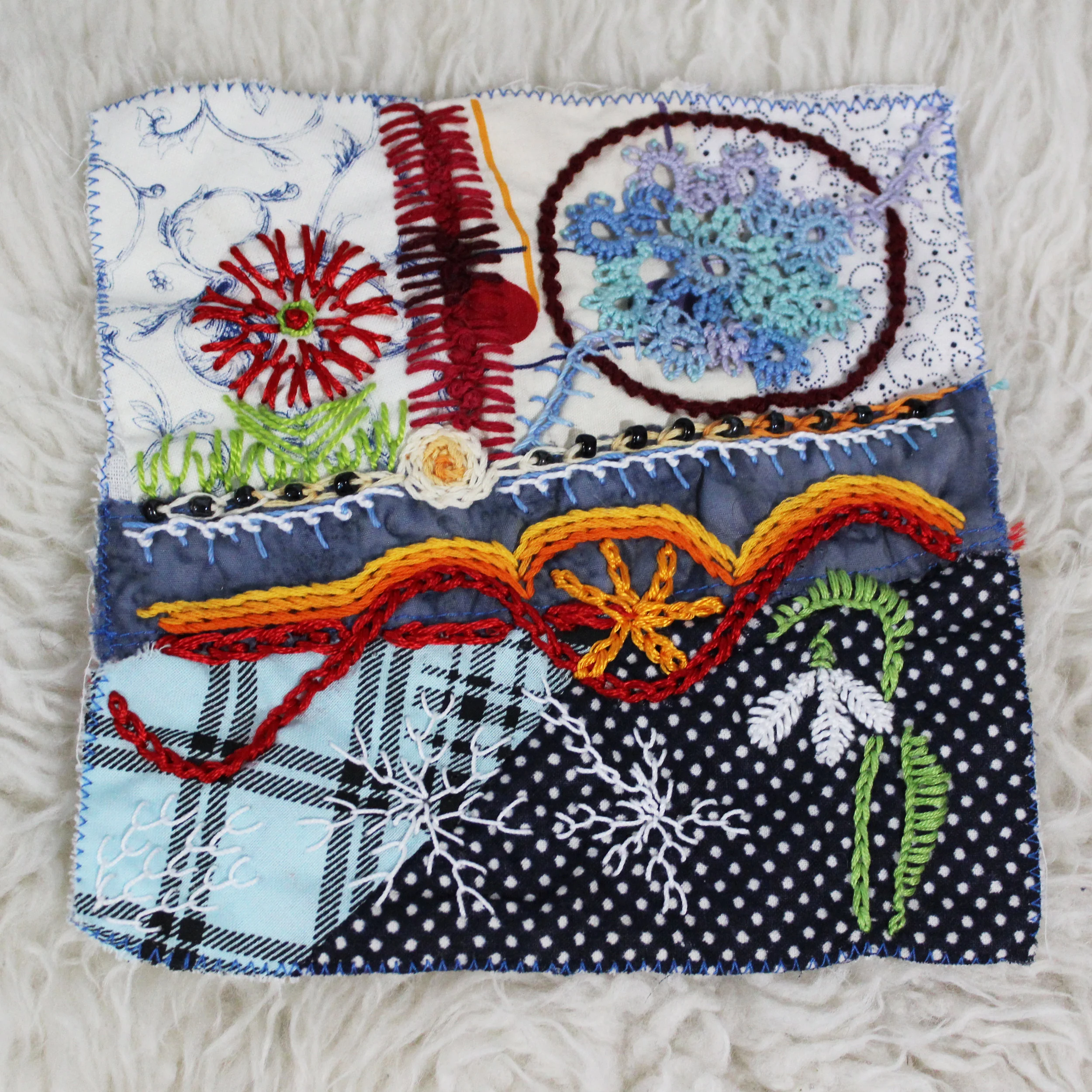 The feather stitch reminded me of hoar frost on flora and objects/structures, and felt particularly fitting with this past week’s polar vortex. I decided to fill in the remaining part of the block with the feather stitches in no particular pattern, trying to make one in a circular pattern at first but then decided to just throw them in however. Frost has taken over, as a grand finale to January.