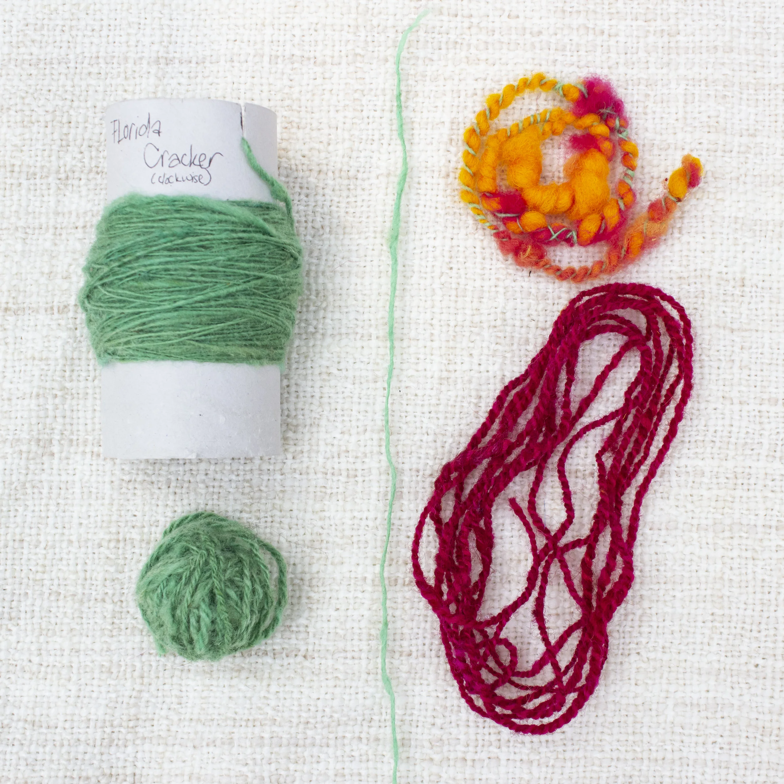 Various spun yarns - single, poofy thick & thin art yarn, 2-ply red, navajo (chain) plied green